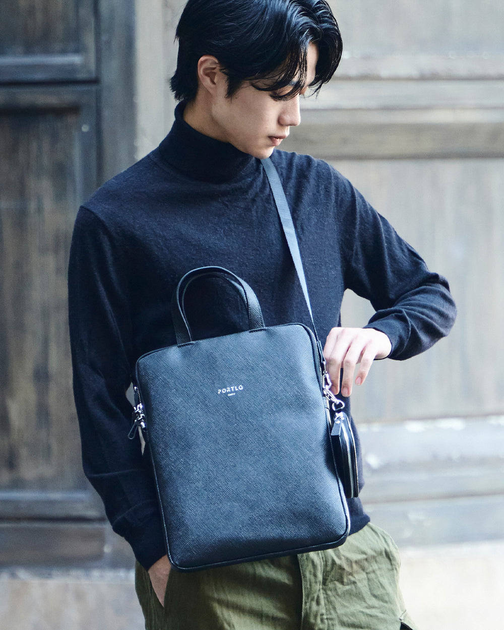 PCと財布や小物だけを持って、ちょっと外でお仕事。場所を取らないスリムな設計はパブリックなスペースにぴったり。ビジネスマンにとっては、社内での打ち合わせ移動時やPC作業時にも使えるため、オフィスにひとつ持っていると大変便利なアイテムです。スリムでスマートなフォルムはスーツスタイルをワンランク上に演出します。